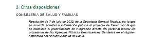 • Resolución de 7 de julio de 2022, de la Secretaría General Técnica, por la que se acuerda someter a información pública el proyecto de Orden por la que se establece el procedimiento de integración directa del personal laboral fijo procedente de las Agencias Públicas Empresariales Sanitarias en el régimen estatutario del Servicio Andaluz de Salud.