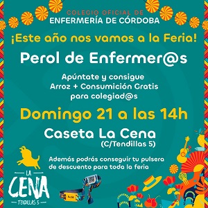 El Colegio Oficial de Enfermería de Córdoba ha organizado un perol de convivencia para que las enfermeras y enfermeros cordobeses puedan compartir un rato distendido durante la próxima Feria de Córdoba. Será durante el primer domingo de Feria, el 21 de mayo, a las 14.00 horas, en la caseta La Cena, en la calle Tendillas, 5 del recinto de El Arenal.