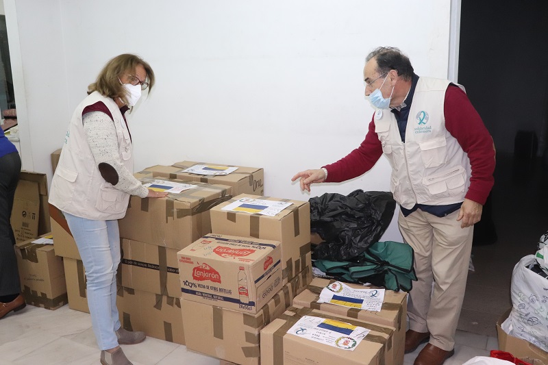 Voluntarios de la Delegación cordobesa de Solidaridad Enfermera hacen entrega de un primer lote de ayuda humanitaria recogida en el punto habilitado en la sede colegial para contribuir a canalizar la solidaridad de todas las enfermeras y ciudadanos cordobeses hacia la población ucraniana, ante la crisis humanitaria provocada por la invasión rusa.