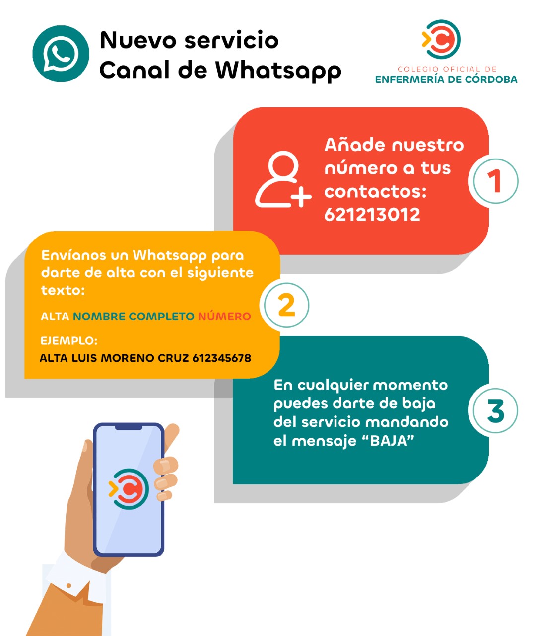 Como el Colegio Oficial de Enfermería de Córdoba ha venido informando desde el mes de enero, ya está disponible el nuevo canal de información a través de WhatsApp del Colegio, configurado como una lista de distribución en la que todas las enfermeras y enfermeros que PREVIAMENTE SE HAYAN DADO DE ALTA en este nuevo servicio gratuito del Colegio, recibirán noticias e información relevante sobre diversos aspectos colegiales y en torno a la Enfermería.