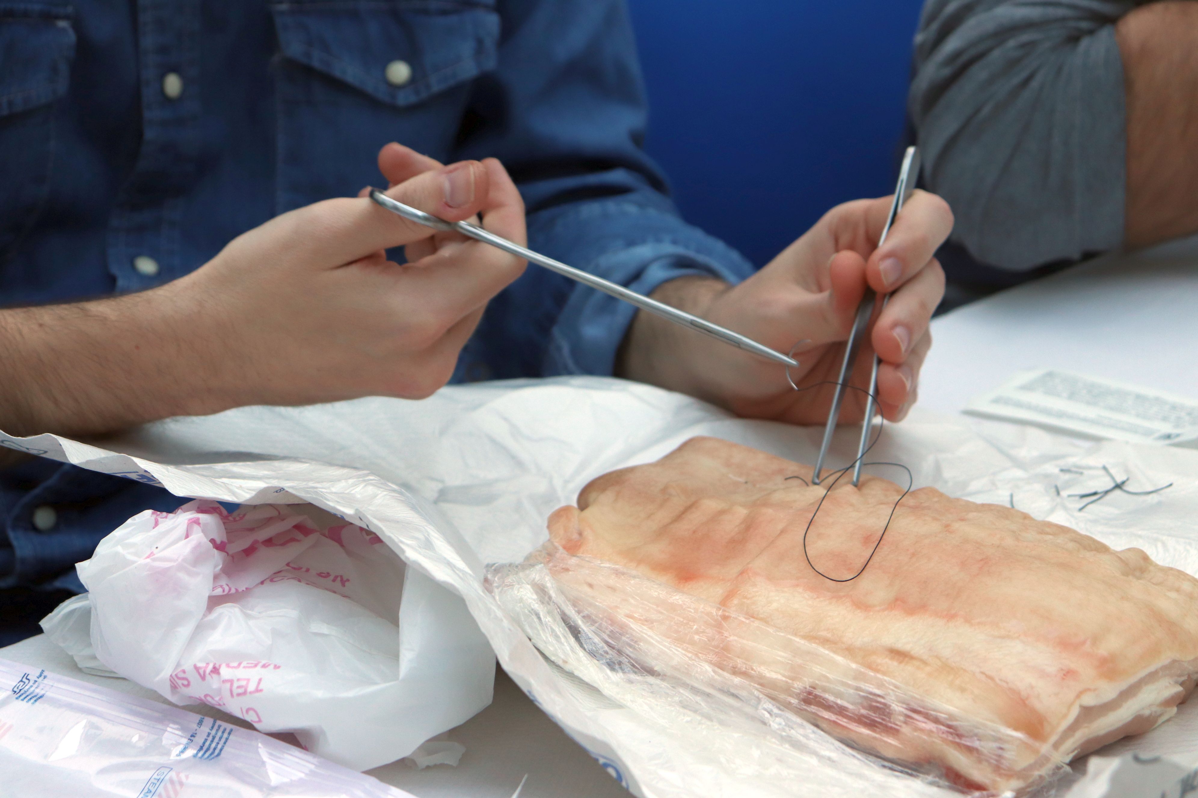La práctica se ha llevado a cabo sobre panceta de cerdo, la piel más parecida a la del ser humano, y en ella han trabajado sobre cortes a distinta profundidad, eligiendo el material más adecuado según el tipo de herida.