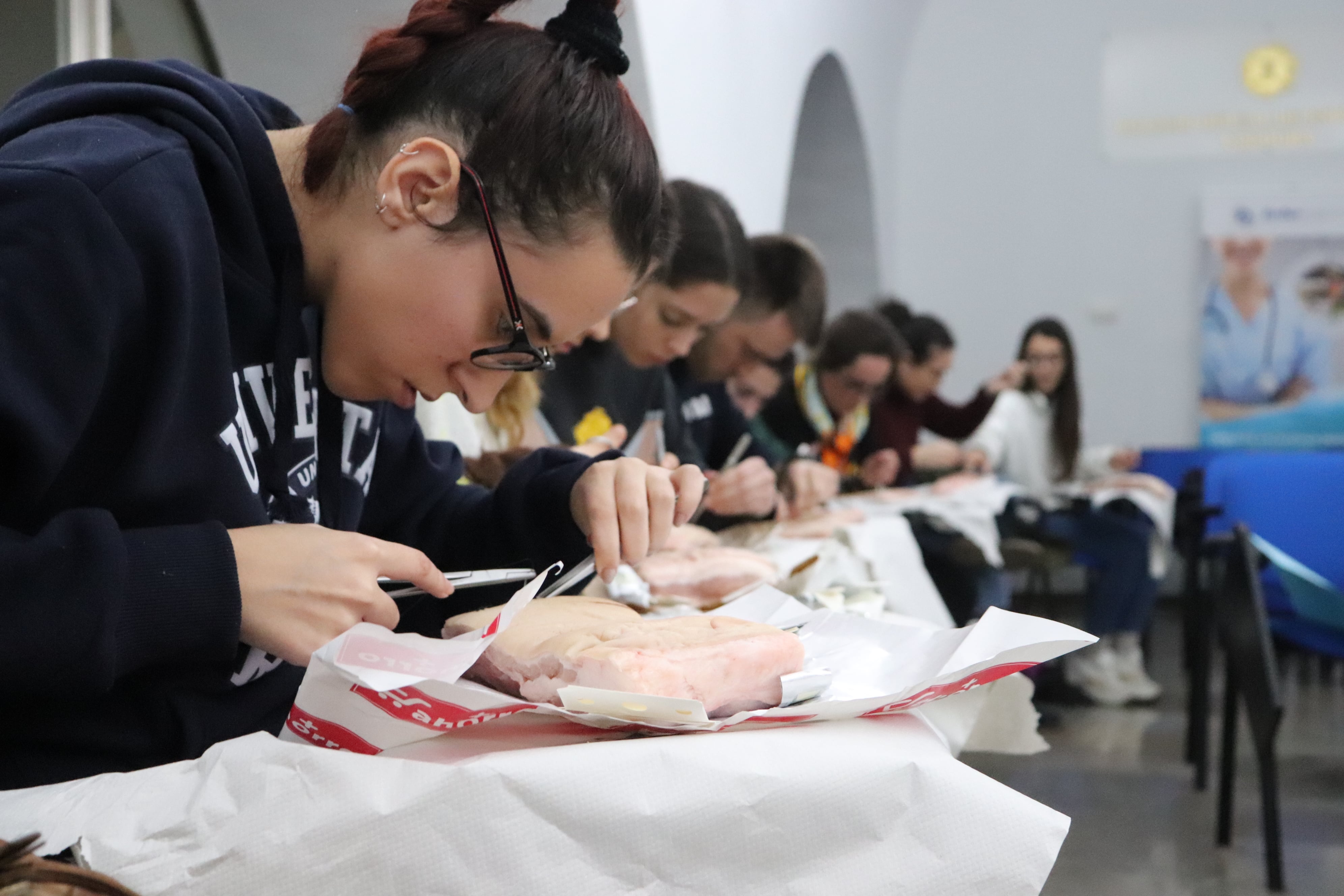 Uno de los puntos fuertes de este taller es su marcado carácter práctico. Unos ejercicios de sutura que se han realizado sobre panceta de cerdo, por ser esta la piel más parecida a la del ser humano. Los enfermeros y enfermeras han trabajado así sobre cortes a distinta profundidad, eligiendo el material más adecuado según el tipo de herida.
