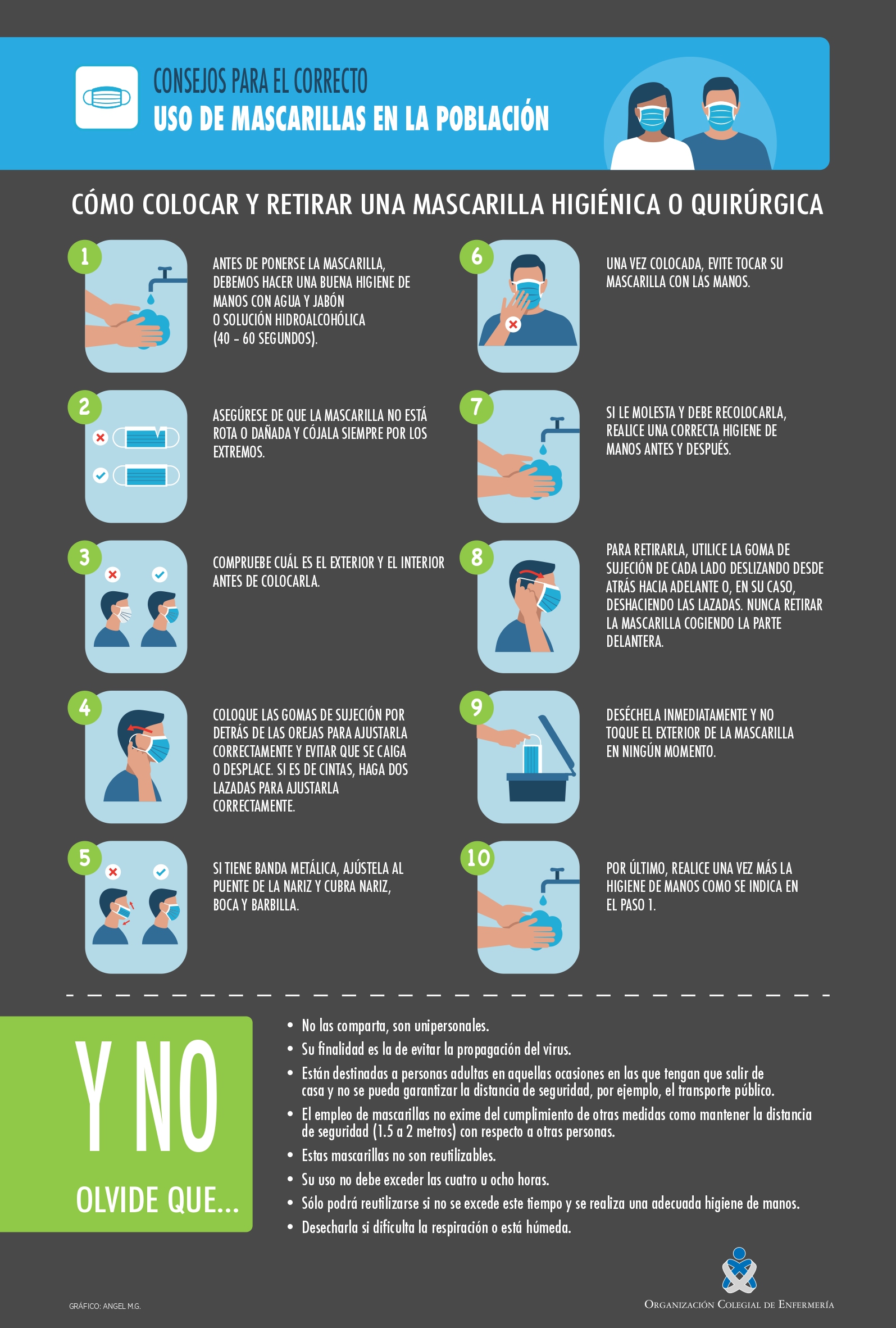 Ante la recomendación del Ministerio de Sanidad de que la población general utilice mascarillas higiénicas o quirúrgicas en aquellos desplazamientos al centro de trabajo en los que no esté garantizada la distancia de seguridad y su distribución en el transporte público, el Consejo General de Enfermería y toda la Organización Colegial han elaborado un nuevo material informativo en el que se explica de manera didáctica cómo se deben utilizar estas mascarillas, haciendo especial hincapié en el momento de su colocación y retirada. Una vez más, esta información se presenta en dos formatos: infografía y video.