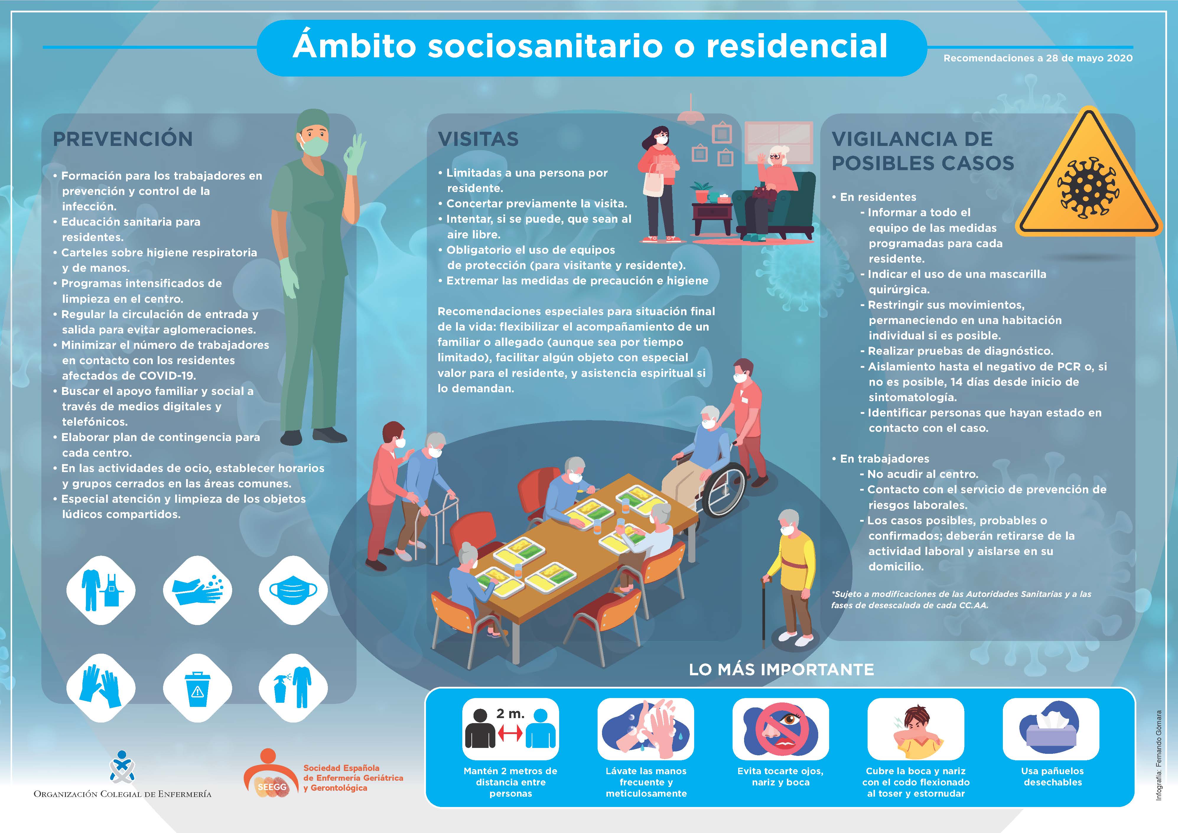 Y toda esta labor debería ir acompañado de carteles informativos sobre higiene respiratoria y de manos por el centro e intensificar la limpieza de los centros. Cada centro deberá elaborar su plan de contingencia. Como ocurre en el exterior es importante evitar aglomeraciones para poder mantener la distancia de seguridad de dos metros por lo que hay que regular la circulación de entrada y salida de las personas. Cuando se retomen las actividades de ocio en las residencias se deben establecer horarios y grupos cerrados en las áreas comunes para minimizar el contacto entre residentes disminuyendo el riesgo ante posibles nuevos casos.
