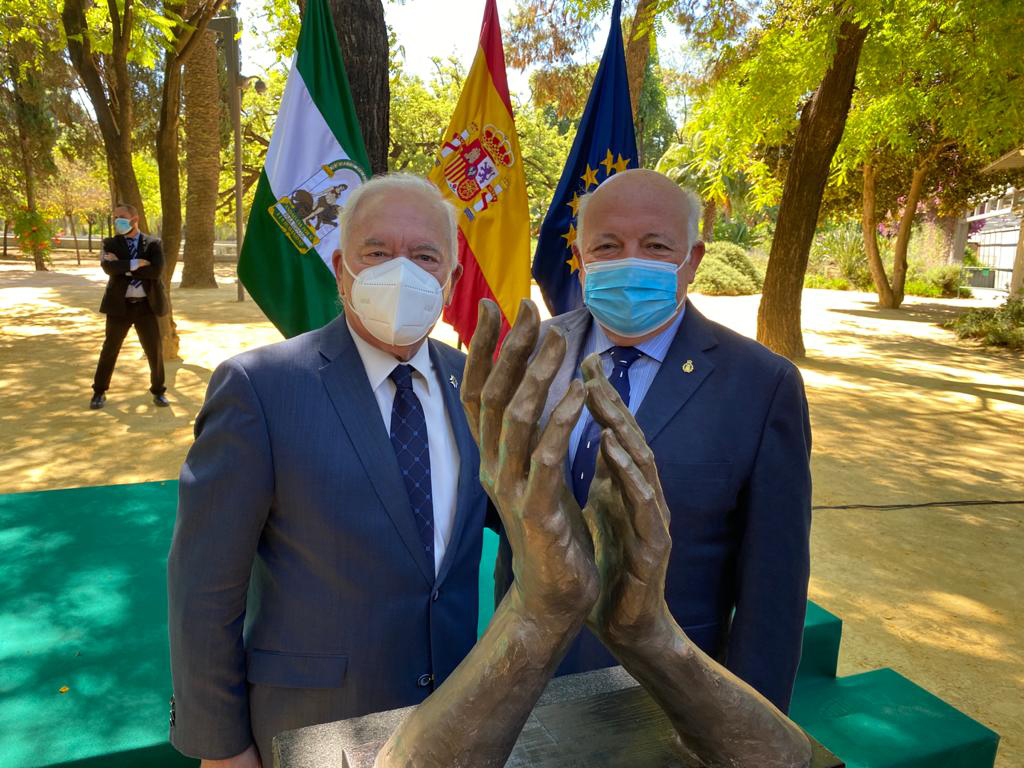 La Junta de Andalucía ha presentado en un acto en el Palacio de San Telmo ocho esculturas del artista sevillano Navarro Arteaga que homenajean el trabajo de los profesionales sanitarios ante la pandemia por Covid-19. Estas obras se instalarán en reconocidos puntos de las capitales de provincia de Andalucía y muestran dos manos juntas como forma de representar los aplausos que los ciudadanos han dedicado a enfermeras y profesionales sanitarios en los meses de confinamiento en sus hogares.