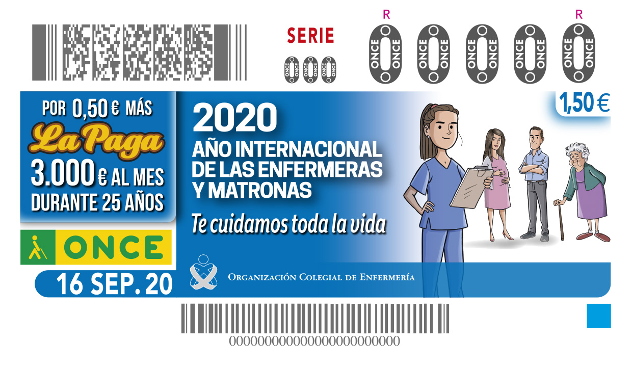 La ONCE difunde en el cupón de este miércoles, 16 de septiembre, la celebración de ‘2020 Año Internacional de Enfermeras y Matronas’. Cinco millones y medio de cupones homenajearán a estos profesionales de la salud y la sanidad, que han tenido un papel clave y siguen teniéndolo durante la pandemia.