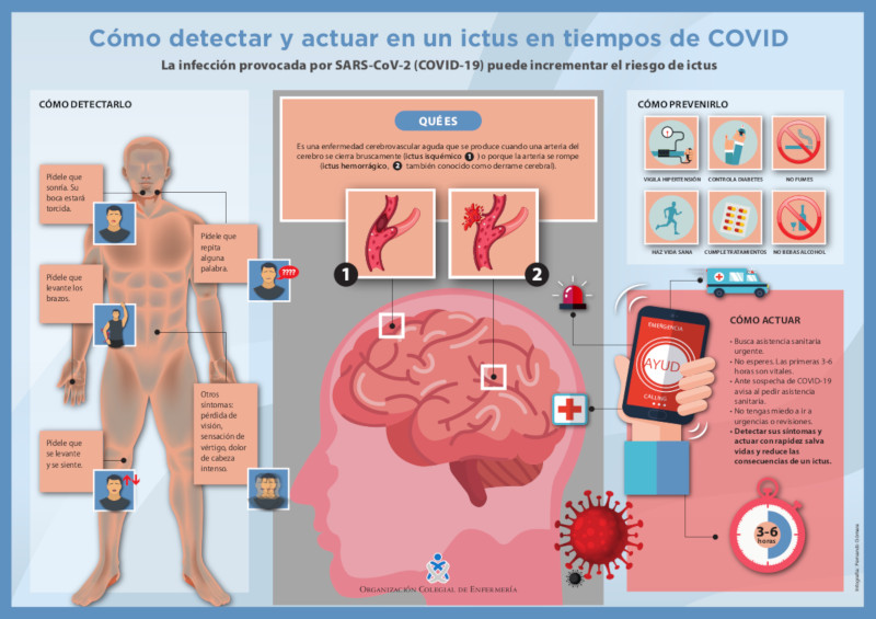 Por ello, con motivo del Día Mundial del Ictus que se celebra cada 29 de octubre, el Consejo General de Enfermería ha editado una infografía y un vídeo animado con recomendaciones para saber cómo detectarlo y cómo actuar ante un posible caso. “El ictus es una emergencia sanitaria que requiere atención urgente en las primeras 3-6 horas, pues la actuación precoz es fundamental para evitar muertes y reducir las consecuencias de las secuelas que provoca, por ello resulta de vital importancia detectar sus síntomas y actuar con celeridad. Sin embargo, durante la pandemia muchas personas han cogido miedo a acudir a urgencias o pedir asistencia sanitaria, lo que puede ser fatal en una patología tan tiempo-dependiente como esta, máxime cuando se ha comprobado que el COVID-19 es un factor de riesgo”, explica Florentino Pérez Raya, presidente del Consejo General de Enfermería.