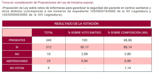 En la Sesión Plenaria que tuvo lugar este martes en el Congreso de los Diputados, la mayoría de los grupos parlamentarios – a excepción de PNV y JxCat- mostraron su apoyo a que se tramite la Iniciativa Legislativa Popular (ILP) que solicita una Ley que establezca las ratios de enfermeras adecuadas para garantizar la seguridad de los pacientes del Sistema Nacional de Salud. Una reivindicación histórica del Consejo General de Enfermería (CGE) que se ha visto materializado en esta ILP iniciada por el Sindicato de Enfermería SATSE con el apoyo del propio CGE.