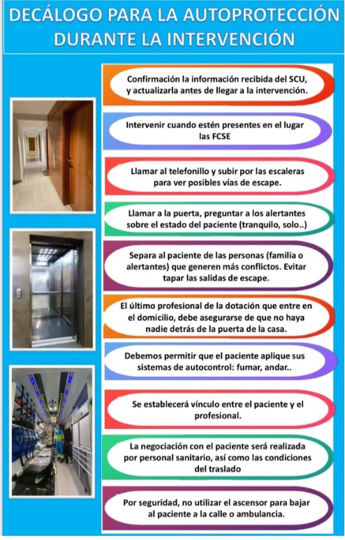 Este decálogo incluye unas normas básicas de actuación que pueden ayudar a mejorar la seguridad en los equipos sanitarios de atención. Los autores recuerdan que este decálogo "no es obligatorio, pero intenta ayudar en el conjunto de una intervención en la que unas normas básicas de actuación para nuestra seguridad pueden evitar lesiones".
