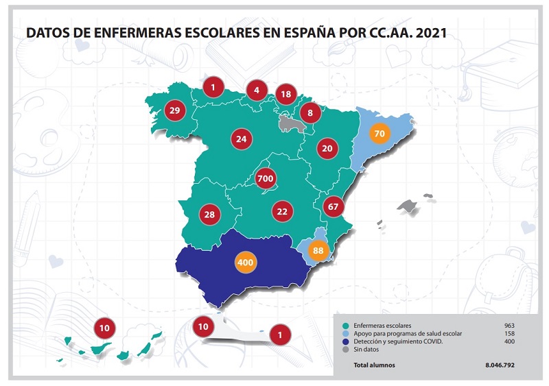 Los datos recogidos muestran que la figura de la enfermera escolar es anecdótica y claramente insuficiente en muchas Comunidades Autónomas. Asturias, por ejemplo, sólo cuenta con una enfermera para 131.480 alumnos, Castilla-La Mancha con 22 para 335.308 alumnos, o Canarias con 10 para 326.105. “Lo que hemos detectado es que en muchos casos los datos no reflejan la figura de la enfermera escolar asignada a un centro de enseñanza, sino que se trata de refuerzos esporádicos contratados por la pandemia, como es el caso de Andalucía, en la que hay enfermeras referentes escolares que solo cubren coordinación COVID para seguimiento y detección de casos; o de enfermeras/os que acuden desde el centro de salud con programas de salud coordinados con el centro educativo, como es el caso de Cataluña; o como Murcia que sólo tiene 16 enfermeras escolares y el resto son enfermeras comunitarias escolares del programa PACES, por lo tanto con estas figuras no se cubren las necesidades que tiene la comunidad escolar”, ha resaltado Guadalupe Fontán, enfermera coordinadora del Instituto de Investigación Enfermera.
