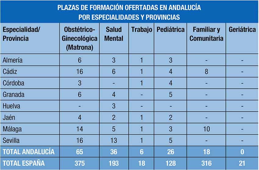 En cuanto a los puestos ofertados para la formación de EIR en Andalucía, por especialidades, el análisis que se realiza desde el Consejo Andaluz es el siguiente: con 65 plazas de Enfermería Obstétrico-Ginecológica (Matrona), esta especialidad pierde 4 plazas de formación con respecto a la convocatoria anterior; las 36 de Enfermería de Salud Mental, si bien aumentan con cuatro plazas repartidas en una por cuatro provincias, hay otras dos provincias con un puesto menos cada una; al mismo tiempo se convocan 6 de Enfermería del Trabajo, dos más que el año pasado; Enfermería Pediátrica gana 2 más, alcanzando las 26, y la especialidad de Enfermería Familiar y Comunitaria dispondrá de un puesto más, con 18 plazas.