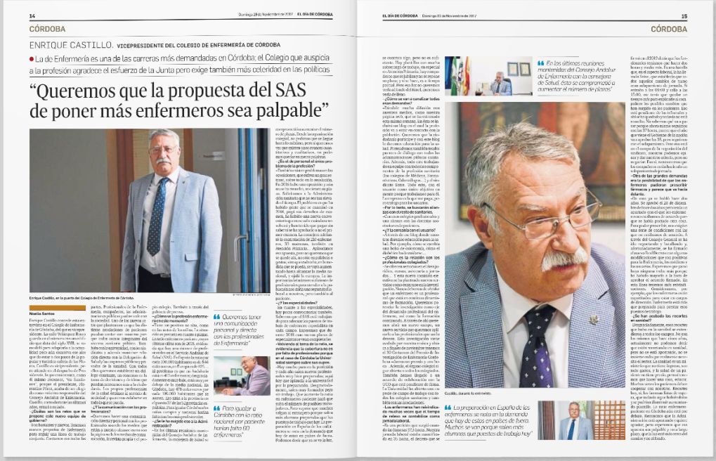 Dicha entrevista, publicada a doble página en la edición del periódico del 19 de noviembre, viene a ser un balance de la situación actual de la profesión en Córdoba, ante la que el vicepresidente expone las propuestas y alianzas que el nuevo equipo de gobierno del Colegio se propone para ir resolviendo los distintos asuntos pendientes que, a nivel político y profesional se presentan a la enfermería.
