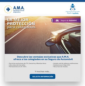 El Colegio Oficial de Enfermería de Córdoba ha alcanzado un acuerdo con A.M.A. Seguros -compañía con la que tiene suscrita la póliza de Responsabilidad Civil profesional para todos los colegiados-, por el cual se ofrece también a todos los enfermeros y enfermeras cordobeses la posibilidad de contratación del Seguro de Automóvil de esta compañía en condiciones muy ventajosas, con una oferta exclusiva de hasta un 45% de descuento en el Seguro de Coche.
