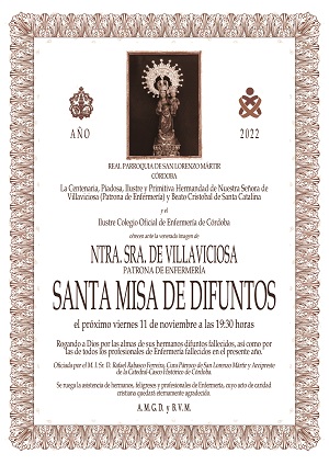 El Colegio Oficial de Enfermería de Córdoba y la Primitiva Hermandad de Nuestra Señora de Villaviciosa, Patrona de Enfermería, convocan a los profesionales enfermeros y cofrades a la misa por el eterno descanso de los profesionales de Enfermería y hermanos fallecidos en el último año, que tendrá lugar el próximo viernes 11 de noviembre, a las 19.30 horas, en la parroquia de San Lorenzo Mártir de Córdoba.