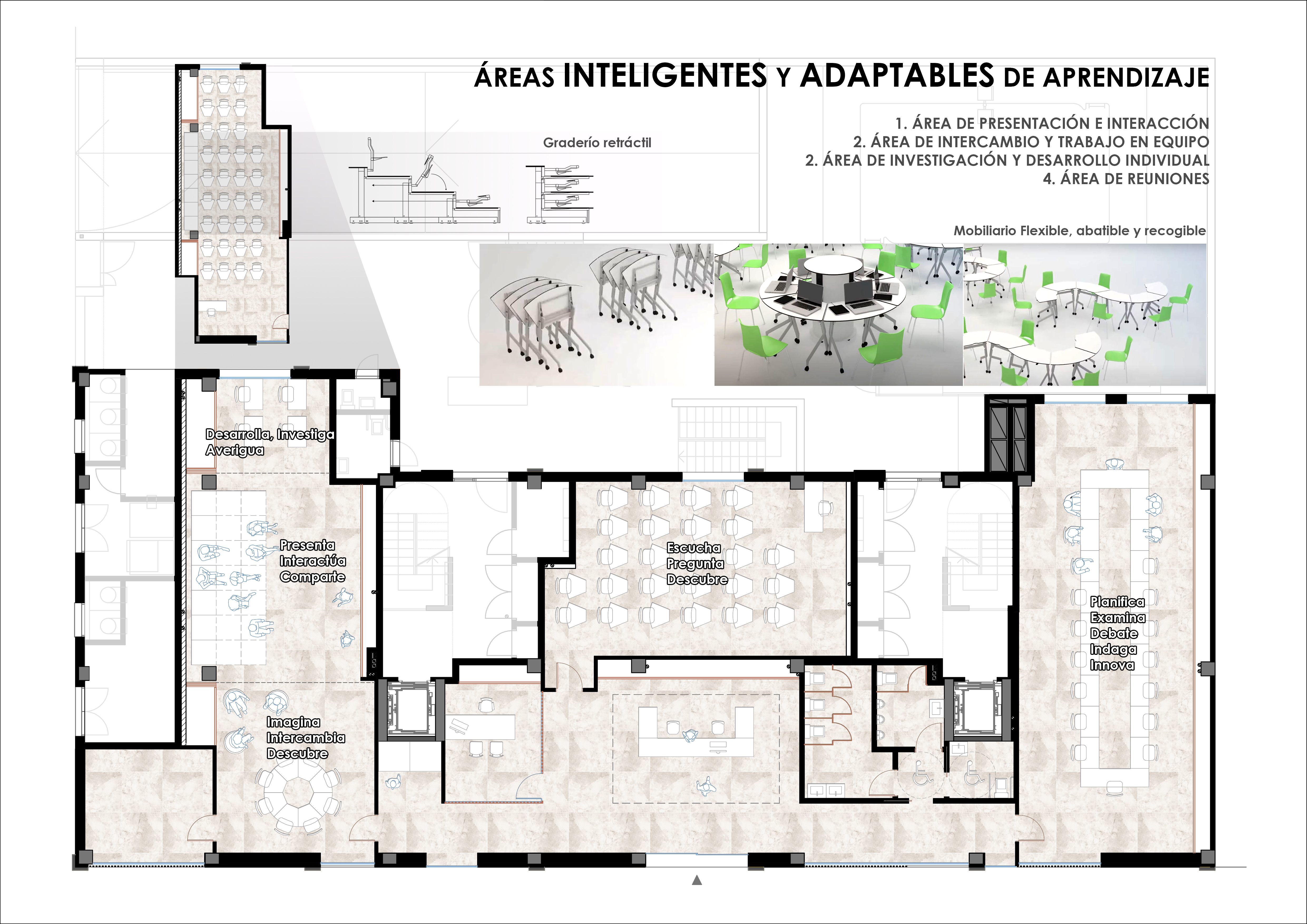 En su diseño interior se está prestando especial importancia a la flexibilidad y el dinamismo, dotando a los distintos espacios de la capacidad de transformarse y adaptarse a diferentes circunstancias y capacidades. Algo que se conseguirá con el empleo de tabiques móviles y materiales acústicos, así como con la selección de un mobiliario dinámico, abatible y fácilmente recogible, con graderíos retráctiles. De este modo habrá la posibilidad de crear compartimentaciones temporales del espacio para disponer de diferentes configuraciones de aulas, ya sean zonas de presentación, áreas de trabajo en equipo, aulas de investigación y desarrollo individual, aulas convencionales o salas de juntas.