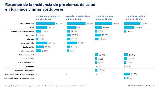 Enrique Castillo también ha destacado el resto de patologías que más incidencia tienen o más preocupan entre los padres y madres, por etapas educativas. Así, y entre otras, las alergias también preocupan al 60,8% de las familias en primer ciclo de Infantil; tema que también inquieta en el segundo ciclo de Infantil al 44,4% de los encuestados, junto al COVID-19 y las gastroenteritis. Ya en Primaria, y tras el acoso escolar, lo que más preocupa es el déficit de atención, el estrés y ansiedad y la diabetes; y en Secundaria, las adicciones a las drogas y al tabaco, y también el estrés, se sitúa entre las principales preocupaciones.