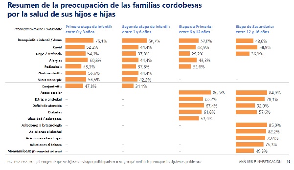 En concreto, y por etapas educativas, la bronquiolitis infantil y el asma es lo que más preocupa a los padres y madres de la provincia con hijos en la etapa educativa de Infantil, ya que el 76,1% de las familias con niños de 0 a 3 años (primer ciclo de Infantil), y el 66,7% con niños de 3 a 6 años (segundo ciclo de Infantil) señala preocuparle mucho o bastante estos problemas, cuya incidencia real alcanza casi el 24% y el 11,1% en cada ciclo, respectivamente. No obstante, son las gripes y resfriados las enfermedades que, con diferencia, más padecen los niños y jóvenes cordobeses de Infantil, Primaria y Secundaria, con porcentajes que van del 74% en el caso de los alumnos de 12 a 16 años hasta el 87% para los de 0 a 3 años.