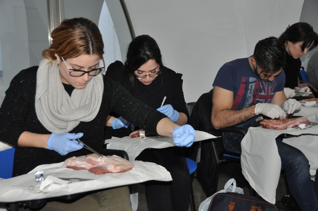 Para practicar estas técnicas, los profesionales de enfermería realizan los diferentes tipos de suturas sobre trozos de panceta de cerdo con piel, por ser el tejido más similar al humano.