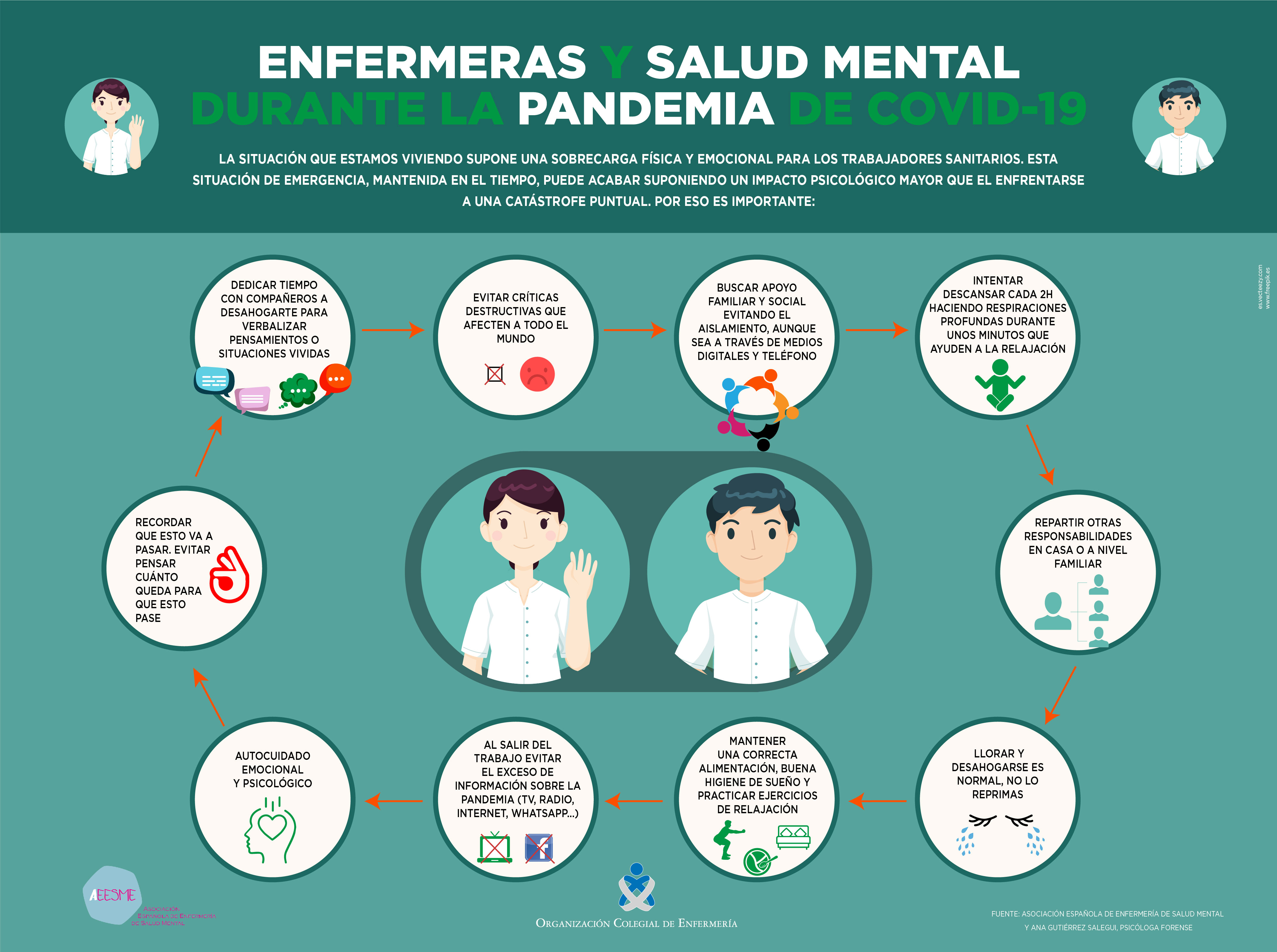 Por ello, la Organización Colegial de Enfermería, en colaboración con la Asociación Española de Enfermería de Salud Mental (AEESME) y la psicóloga forense, Ana Gutiérrez Salegui, ha realizado una infografía y un vídeo con 10 pautas para evitar que esta situación, mantenida en el tiempo, pueda acabar suponiendo un impacto psicológico muy grande en las enfermeras que se enfrentan cada día al COVID-19. Las recomendaciones son: