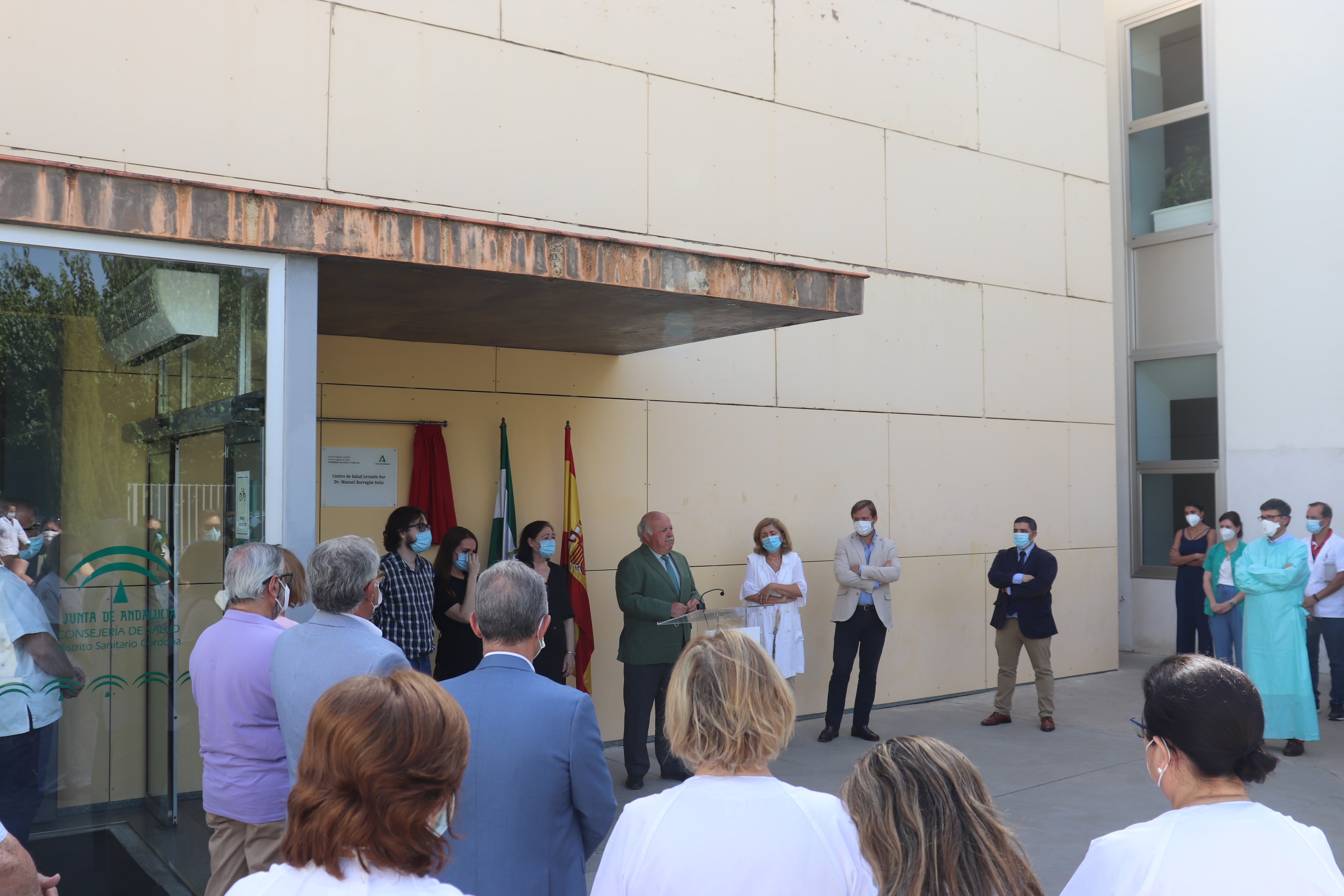 El Colegio Oficial de Enfermería de Córdoba ha acudido este jueves 30 de julio al homenaje al médico cordobés Manuel Barragán, fallecido a causa de la Covid-19, en el centro de salud Levante Sur. Este centro, en el que trabajó este facultativo, pasa a denominarse "Dr. Manuel Barragán Solís" en recuerdo a su labor y entrega. El acto ha contado con la presencia de los familiares del facultativo, compañeros sanitarios, el consejero de Salud y Familias, Jesús Aguirre, la delegada de Salud, María Jesús Botella y el delegado del Gobierno de la Junta de Andalucía, Antonio Repullo . El organismo enfermero, representado por el vicepresidente de la entidad, Enrique Castillo, y la secretaria del mismo, Antonia Ordóñez, ha acudido al acto como muestra de reconocimiento al desempeño de este profesional.
