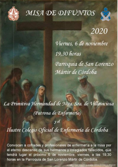 El Colegio Oficial de Enfermería de Córdoba y la Primitiva Hermandad de Nuestra Señora de Villaviciosa, Patrona de Enfermería, convocan a los profesionales enfermeros y cofrades a la misa por el eterno descanso de los colegiados y hermanos fallecidos en el último año, que tendrá lugar el próximo viernes 6 de noviembre, a las 19.30 horas, en la parroquia de San Lorenzo Mártir de Córdoba.