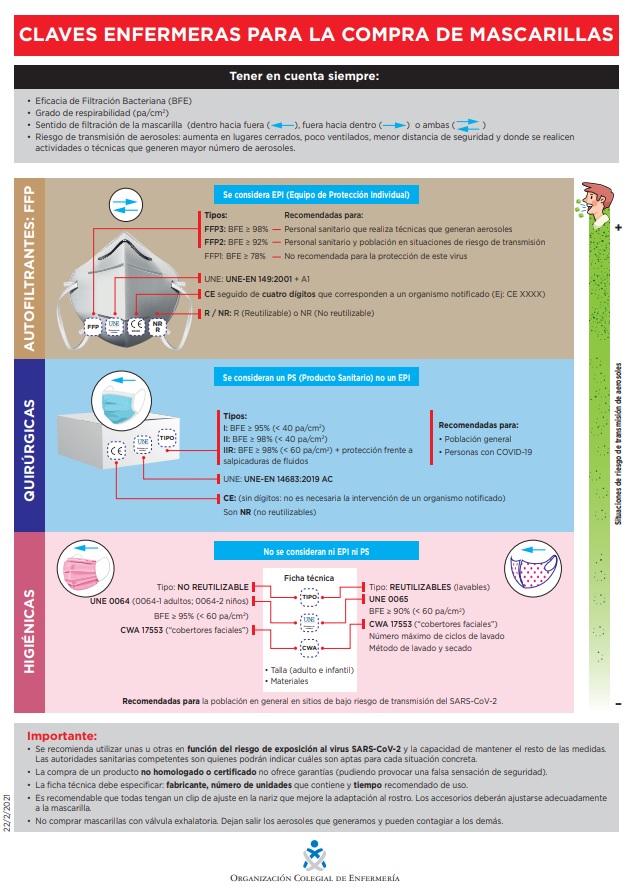 A pesar del que el BOE, en este caso, sólo se refiere a las mascarillas higiénicas, la Organización Colegial de Enfermería incluye en esta nueva infografía también las recomendaciones para las conocidas como autofiltrantes y las quirúrgicas, para ayudar a comprar las que siguen las regulaciones establecidas para ambas. “Es importante interiorizar que la protección depende de la situación concreta. Debemos evaluar el riesgo de transmisión del SARS-CoV-2, siendo mayor en espacios cerrados con poca ventilación, en los que sea más complicado mantener la distancia de seguridad y donde se realicen procedimientos que aumenten la generación de aerosoles”, recalca Florentino Pérez Raya, presidente del Consejo General de Enfermería y del Colegio Oficial de Enfermería de Córdoba.