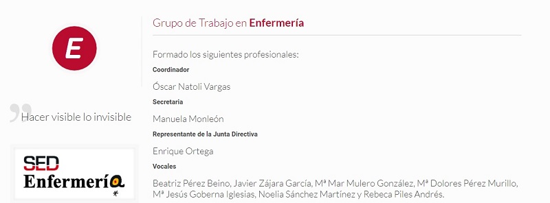La Sociedad Española del Dolor (SED) ha puesto en marcha recientemente el Grupo de Trabajo de Enfermería (GTSED_E). Dicho grupo está formado por profesionales de la Enfermería que, a nivel nacional, van a velar por impulsar el papel de la enfermería en dolor, definiendo un perfil profesional específico mediante la concreción de aquellas competencias propias en este ámbito.