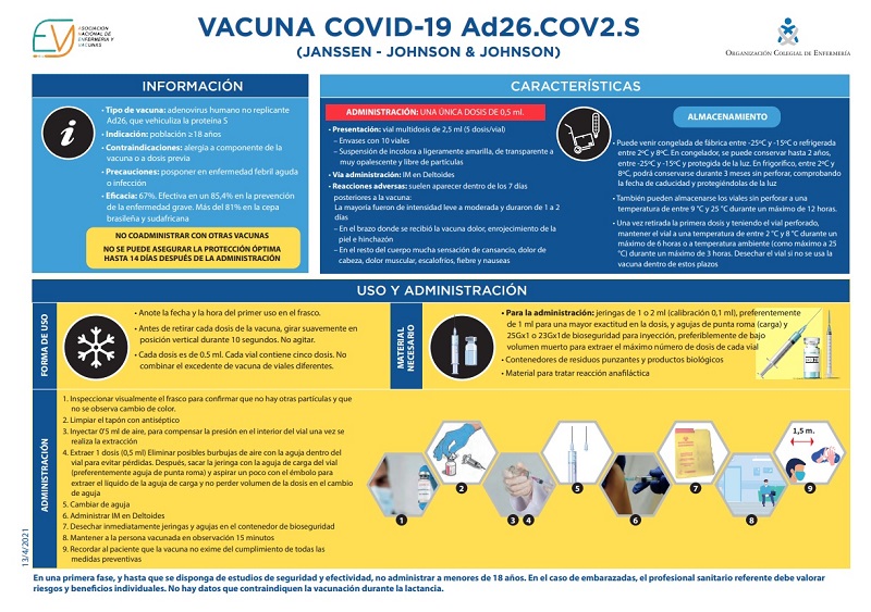 En esta infografía dirigida a las 316.000 enfermeras y enfermeros españoles se explica de forma detallada todos y cada uno de los puntos clave que deben conocer a la hora de comenzar la vacunación con las dosis de Janssen. Información sobre la vacuna, características específicas como la pauta, las posibles reacciones adversas y la forma de almacenamiento, así como la manera de administrarla son algunos de los temas que contempla esta infografía de uso libre para todos los profesionales.