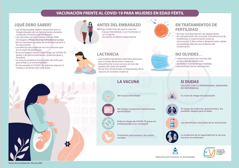 Para resolver todas las dudas que plantean las embarazadas, o en periodo de lactancia, frente al COVID-19, el CGE y ANENVAC publicaron a primeros de julio la infografía que se adjunta en esta información y un vídeo animado. En ellos se cubren todos los aspectos relacionados con la vacunación para mujeres en edad fértil, tanto antes del embarazo, como en la lactancia o en caso de tratamientos de fertilidad. Así, “según la última evidencia disponible, lo que sabemos es que no es necesario ni posponer ningún tipo de tratamiento de fertilidad o de fecundación in vitro, ni esperar ningún tiempo para buscar el embarazo. La vacuna ni causa infertilidad ni aumenta el riesgo de aborto espontáneo. La única precaución es evitar la vacunación tres días antes y después de someterse a una recuperación de ovocitos, transferencia de embriones o inseminación, pero por poder vigilar mejor los posibles efectos secundarios del tratamiento, no porque suponga ningún problema con la vacunación”, subraya Angulo. Tampoco supone ningún tipo de inconveniente con la lactancia, más bien al contrario, pues “a través de la leche materna, la inmunidad que adquiere la madre se transmite al bebé”, destaca la vocal matrona del CGE.