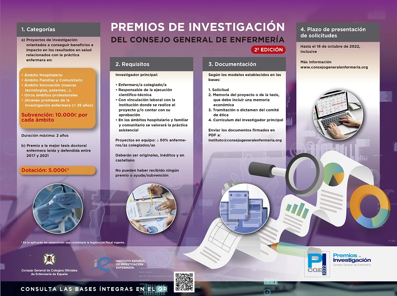 Tras el éxito de la primera edición, con casi 180 trabajos presentados, el Consejo General de Enfermería (CGE) vuelve a convocar sus Premios de Investigación. En esta segunda edición se mantiene la dotación de 55.000 euros, lo que los convierte en uno de los más importantes en este colectivo profesional. Su objetivo principal es incentivar y motivar a las enfermeras y enfermeros en la elaboración y desarrollo de Proyectos de Investigación, así como otorgar visibilidad, difusión y trasferencia de conocimiento con las aportaciones de la profesión enfermera a los resultados de salud.