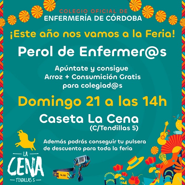 El Colegio Oficial de Enfermería de Córdoba ha organizado un perol de convivencia para que las enfermeras y enfermeros cordobeses puedan compartir un rato distendido durante la próxima Feria de Córdoba. Será durante el primer domingo de Feria, el 21 de mayo, a las 14.00 horas, en la caseta La Cena, en la calle Tendillas, 5 del recinto de El Arenal.