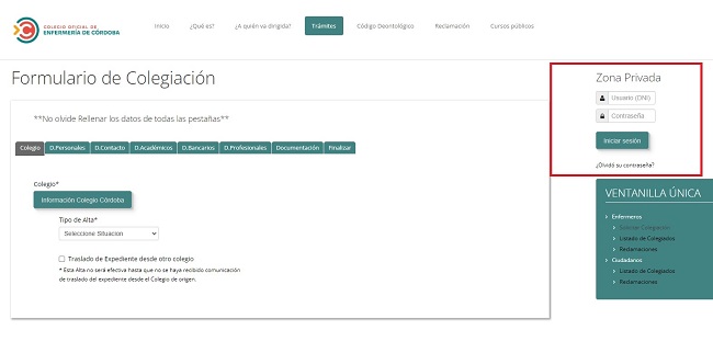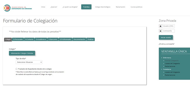 En el caso de NUEVA ALTA O ALTA INICIAL en el Colegio de Enfermería de Córdoba, los interesados deben acceder a la Ventanilla Única y pinchar en el Menú superior "Trámites / Enfermeros / Solicitar Colegiación".