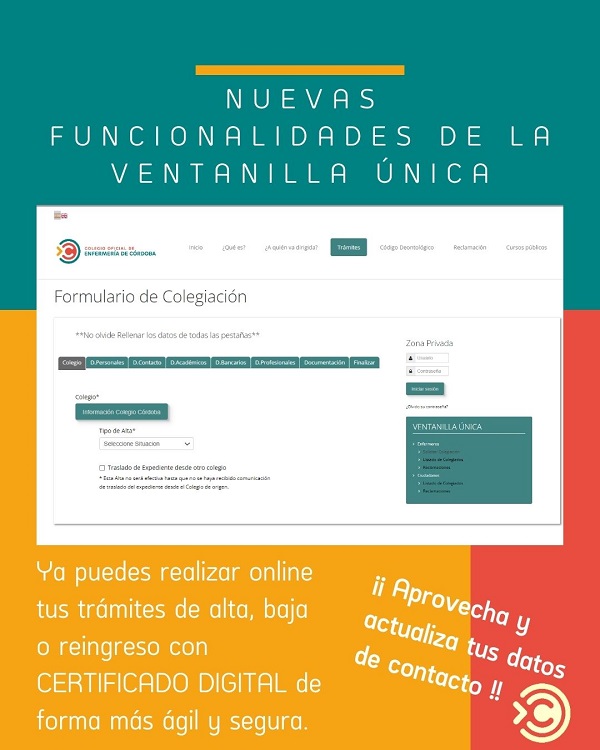 Las anunciadas nuevas funcionalidades de la Ventanilla Única del Colegio Oficial de Enfermería de Córdoba ya están disponibles para todos los colegiados y los nuevos enfermeros interesados en colegiarse, que ya pueden realizar sus trámites de manera online con certificado digital, sin necesidad de tener que desplazarse físicamente a la sede colegial. En concreto, los primeros trámites que ya pueden realizarse son los de la solicitud de alta, baja o reingreso como colegiado.