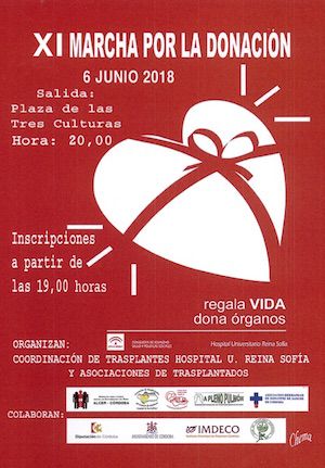 Con motivo de la celebración de la semana del donante de órganos entre los días 4 y 10 de Junio próximos, la coordinación de trasplantes del Hospital Universitario Reina Sofía junto con las asociaciones de trasplantados, realiza varias actividades encaminadas a concienciar a la sociedad en general de la importancia de la donación. Una de estas actividades será, como el pasado año la celebración de una marcha POR LA DONACION que tendrá lugar el día 6 de junio a las 20,00 horas con salida desde la plaza de las Tres Culturas y su recorrido aproximado será de unos 4 Km.