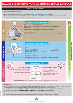 La Organización Colegio de Enfermería elabora una infografía para resolver dudas en torno a las mascarillas más adecuadas para cada situación y en qué debemos fijarnos para comprarlas